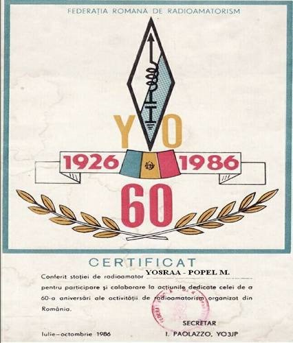 CERTIFICAT-60 de ani de radioamatorism organizat în România