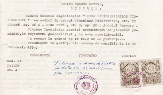 EXTRAS din hotărârea de înființare a asociației LIGA RADIOAMATORILOR CÂMPULUNGENI (LRC).