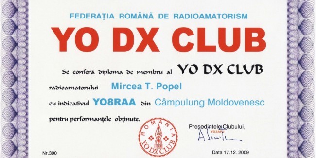 - La începutul anului 1987 am înființat Clubul de Radioamatori - YO8KZA, în cadrul asociației sportive "AS Armata-Explorări" de la IPEG-Suceava. Am obținut prima categorie de clasificare sportivă (titlu: clasa sportivă 1). Pe 20 noiembrie 1987, am susținut examenul și am obținut licența de emisie clasa a II-a, pentru toate benzile. După anul 2000 am obținut licența de emisie clasa I. În 2005 am obținut titlul de Maestru al Sportului și distincția 5BDXCC.