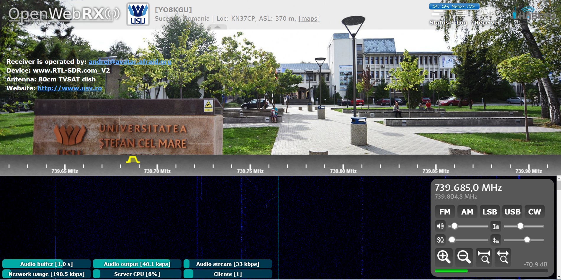 A doua statie de sol se află la Universitatea ““Stefan cel Mare““ din Suceava, īn corpul C si are 2 receptoare cu acces de la distantă prin Internet. Conectarea se poate face prin link-urile de mai jos (se deschide o fereastra separata; functionează numai sub browser-ul Chrome). Primul este programat īn mod normal īn banda de frecvente cuprinsă īntre 145,75 MHz si 146 MHz. Īn principiu aceasta se poate modifica pānă la frecvente de ordinul a 1,5 - 2 GHz, īn functie de necesităti. Al doilea este fixat pe transponderul liniar al satelitului QO-100.