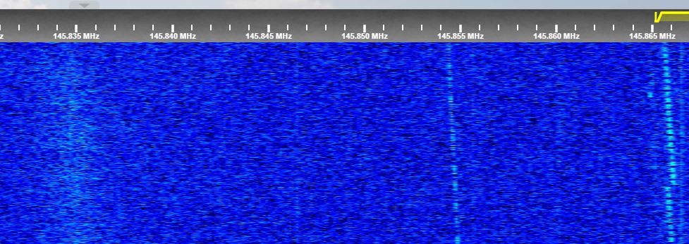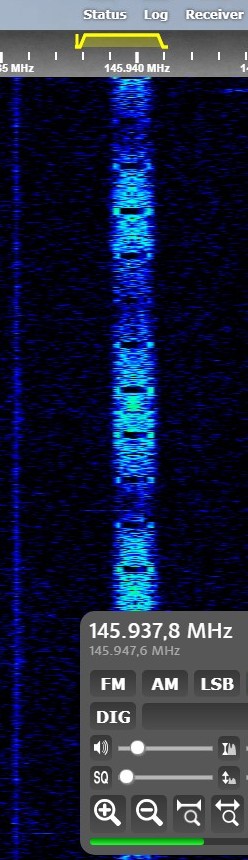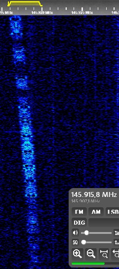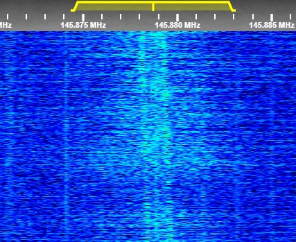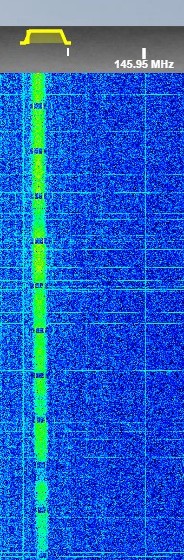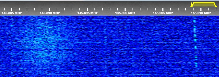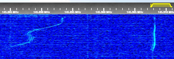 AO-92 - Iesirea repetorului FM; se observa si semnalul DUV ("Data Under Voice"), care transmite informatiii telemetrice peste semnalul de voce prin intermediul unei subpurtătoare de 200 Hz. |